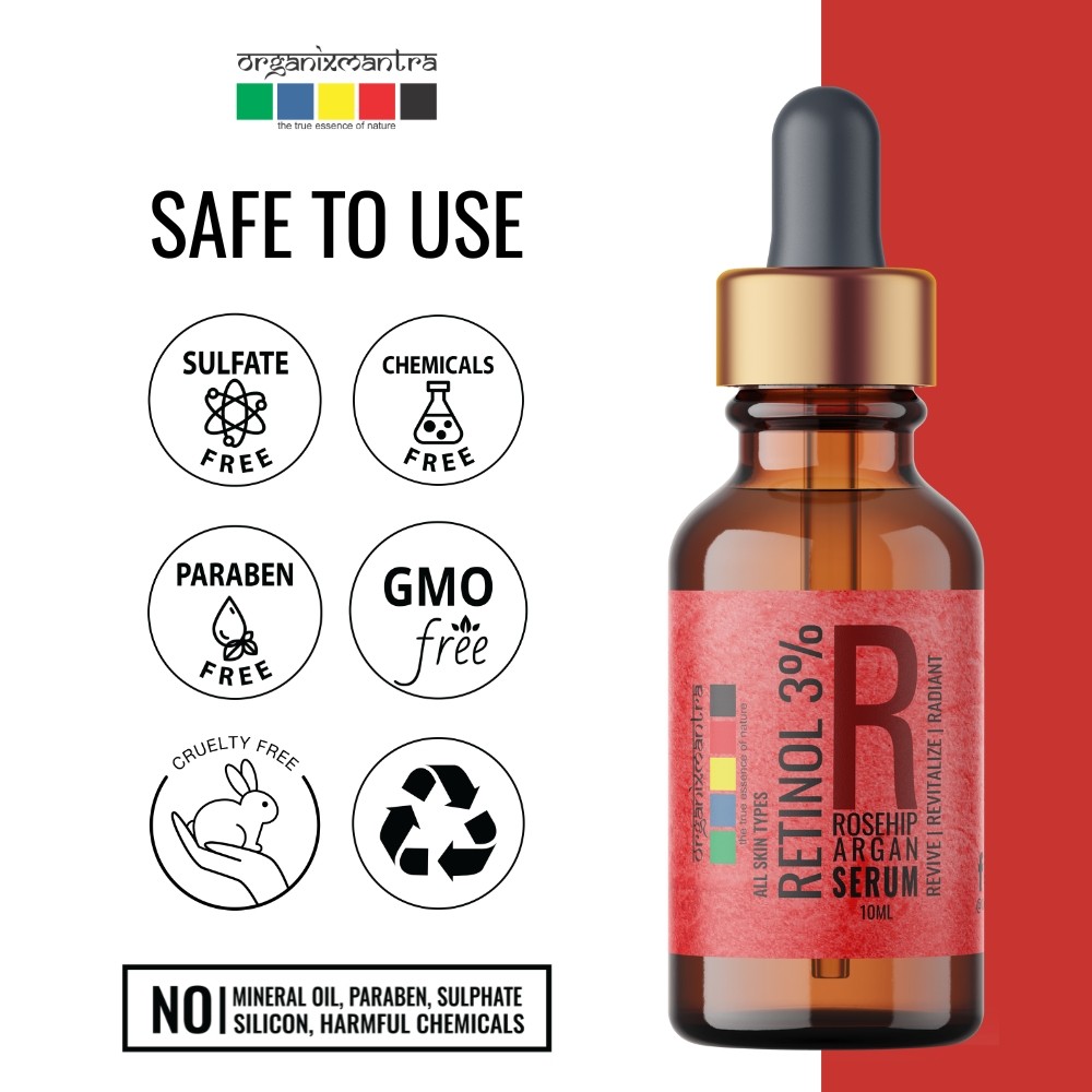 Retinol is a vitamin A derivative that is highly effective in reversing sun damage and signs of aging. Regularly applying Retinol serum is known to aid in cell turnover reduce fine lines, even skin color, improve texture, tighten pores, and stimulate collagen production. Organix Mantra Retinol 3% Serum for face is a balanced blend of Vitamin E, Hyaluronic Acid, Moroccan Argan Oil, and Rosehip Oil.